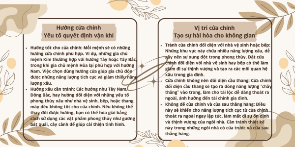 - Hướng tốt cho cửa chính: Mỗi mệnh sẽ có những hướng cửa chính phù hợp. Ví dụ, những gia chủ mệnh Kim thường hợp với hướng Tây hoặc Tây Bắc, trong khi gia chủ mệnh Hỏa lại phù hợp với hướng Nam. Việc chọn đúng hướng cửa giúp gia chủ đón được những năng lượng tích cực và giảm thiểu năng lượng xấu.